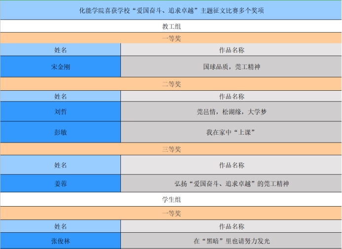 近日,太阳城博彩举办的“爱国奋斗、追求卓越”莞工精神主题征文比赛公布了获奖名单。太阳城娱乐选送的作品在全校教工组、员工组多项作品中脱颖而出,共有11人获奖。其中包括3个一等奖,3个二等奖和5个三等奖。(具体名单如下图)