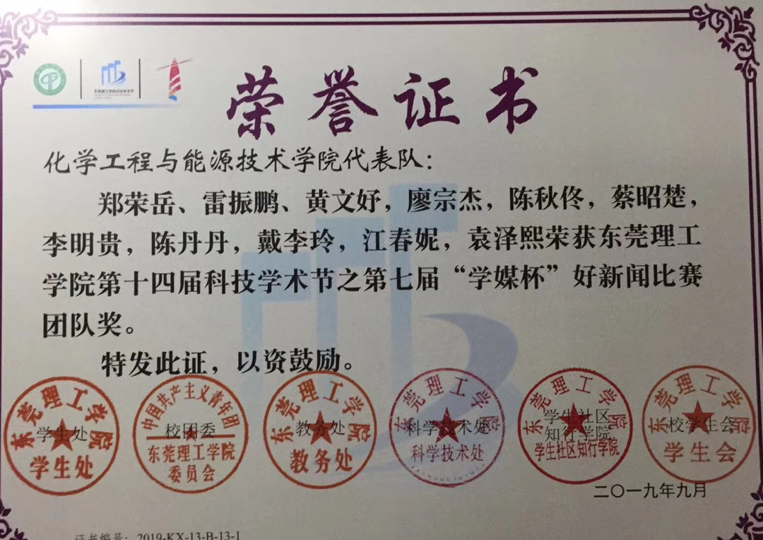 2019年在第十届科技学术节之第七届“学媒杯”好新闻比赛中,化能团学新闻网络部获得团队奖:其中《公司首次获批国家科技部“国际杰青计划”》(作者:郑荣岳、雷振鹏、黄文妤)《太阳城娱乐在校运会中勇夺佳绩》(作者:陈秋佟)两篇消息获得公司“好新闻”优秀消息新闻奖(文字类)。