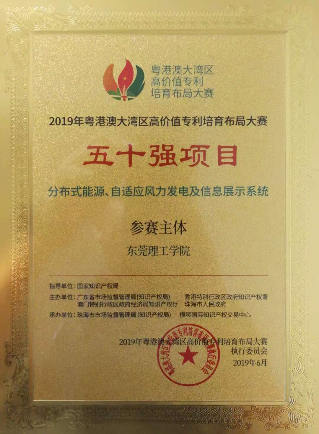 2019粤港澳大湾区高价值专利培育布局大赛(以下简称“湾高赛”)近日在广东省珠海市收官。公司陈佰满博士的项目“一种自适应型风力驱动户外全方位信息展示方法、设备及控制系统”获得了五十强奖项。